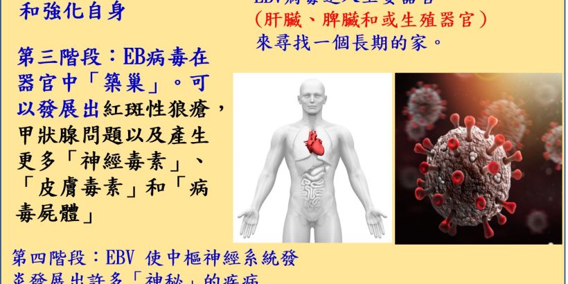 一旦病毒進入主要器官,它就會在那裡築巢。由於病毒隱藏在您的器官中而未被發現,您的身體認為它贏得了戰爭並且入侵者已被摧毀。不幸的是,EB病毒剛剛開始在您的身體中傳播。如果您有一個典型的品種,EB病毒 可能會在您的器官中潛伏數年,可能數十年。而您並不知道。但是,如果您有一個特別具有侵略性的種類,即使在築巢時,EB病毒也可能會產生嚴重的問題。EB病毒還會產生「神經毒素」、「皮膚毒素」、「副產品和病毒屍體」,從而產生更多問題。EB病毒將在第三階段的戰略時期分泌這些特殊毒素,並在第四階段持續分泌,以防止您的免疫系統鎖定病毒並對其進行攻擊。在此階段可能會出現紅斑性狼瘡、甲狀腺問題等。